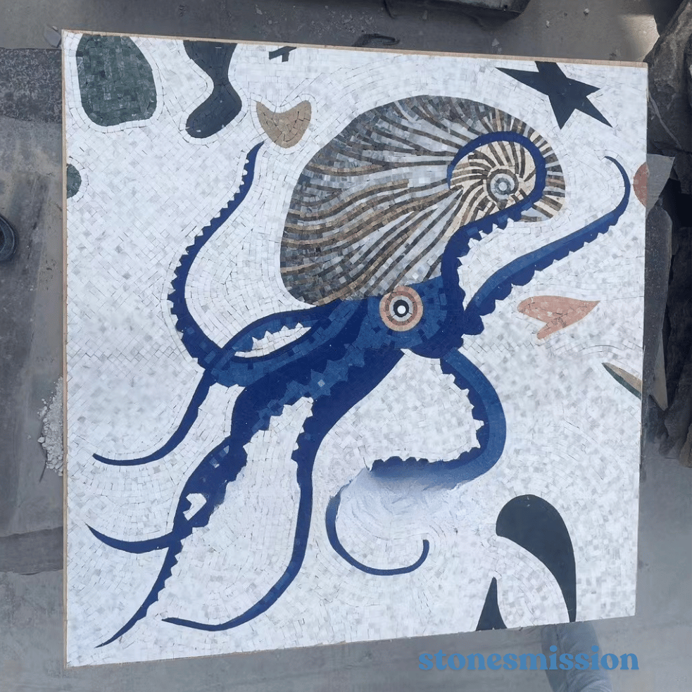 This mosaic artwork depicts a vivid octopus in rich blue, set against a white - toned background with accents like a nautilus shell and stars. Crafted from various colored stone tiles, each small piece is meticulously placed to form a detailed and eye - catching image. Ideal for a beach - house decor, a marine - themed restaurant, or a public aquarium area, it can bring the charm of the ocean indoors and become a focal point that sparks conversation.